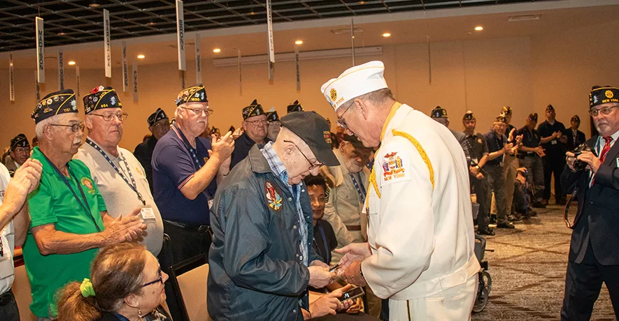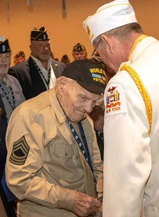 Highlighting the initial moments was a standing ovation for two centenarians from the Greatest Generation of military men, as outgoing Department Commander Keith Koster introduced 102 year-old Addison Sheckler of Cato and 104 year-old Tony Pircio of Manlius.