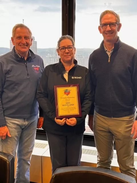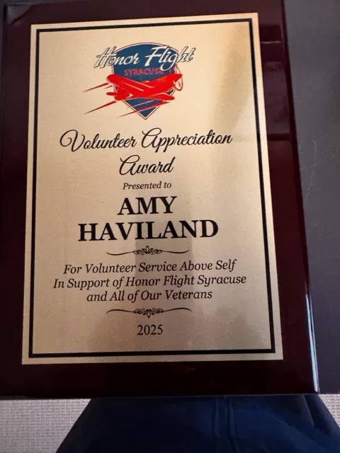 Her husband and his father are both Army veterans. Her brother served in the Navy. And for more than 5 years, Amy Haviland volunteered her service as recording secretary for Honor Flight Syracuse’s philanthropy committee. It’s one of those quiet, behind-the-scenes jobs that makes HFS effective. Operations VP Rob Schoeneck and former philanthropy committee chair Jeff Bastable presented a volunteer appreciation award to Amy at the offices of Bond, Schoeneck and King where she serves as Executive Assistant to the Management Committee. Brian Butler, Management Committee Chair, joined us for the award presentation. Thank you Amy!